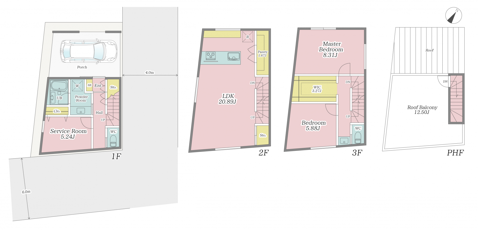 - 北東側私道幅員約4.00mに8.3m、南東側公道幅員約10.97mに6.1m
